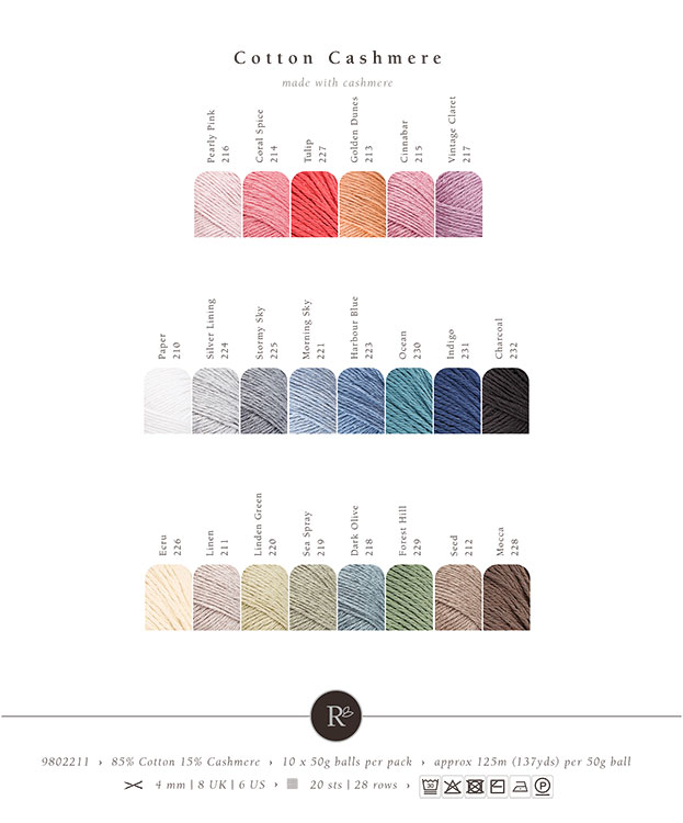 Cotton Cashmere - роскошная мягкая смесь из 85% хлопка и 15% кашемира. Изделия из этой пряжи интересной структуры можно носить в любое время года. Она идеально подходит для женской и мужской одежды и выпускается в сбалансированной цветовой палитре из 16 цветов с эффектом меланжа.