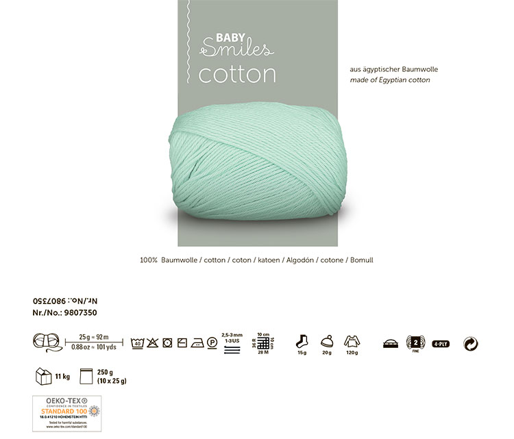 Пряжа Коттон из линейки "Бэби смайлз" - мягкий египетский хлопок, очень маленькие моточки 25 гр. Имеет международный сертификат безопасности OEKO-TEX Standard 100 (можно использовать для младенцев и детей до трех лет). Производитель - Венгрия.