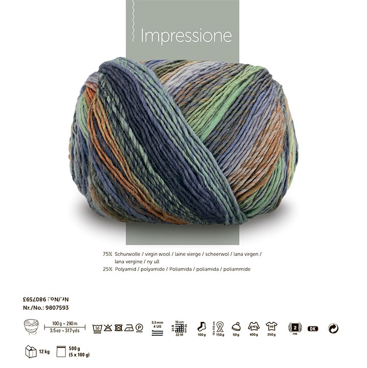Импрешен - это красочная смесь натуральной шерсти и полиамида. Полиамид придаёт изделию долговечность, прочность и возможность легко отстирывать вещь. Эксклюзивное цветовое решение создано с учетом гармоничного сочетания цветов, показывает яркость каждого оттенка, образуя непревзойденный оптический эффект. Пряжа Импрешен идеально подходит как для шалей и аксессуаров, так и для любого вида одежды.