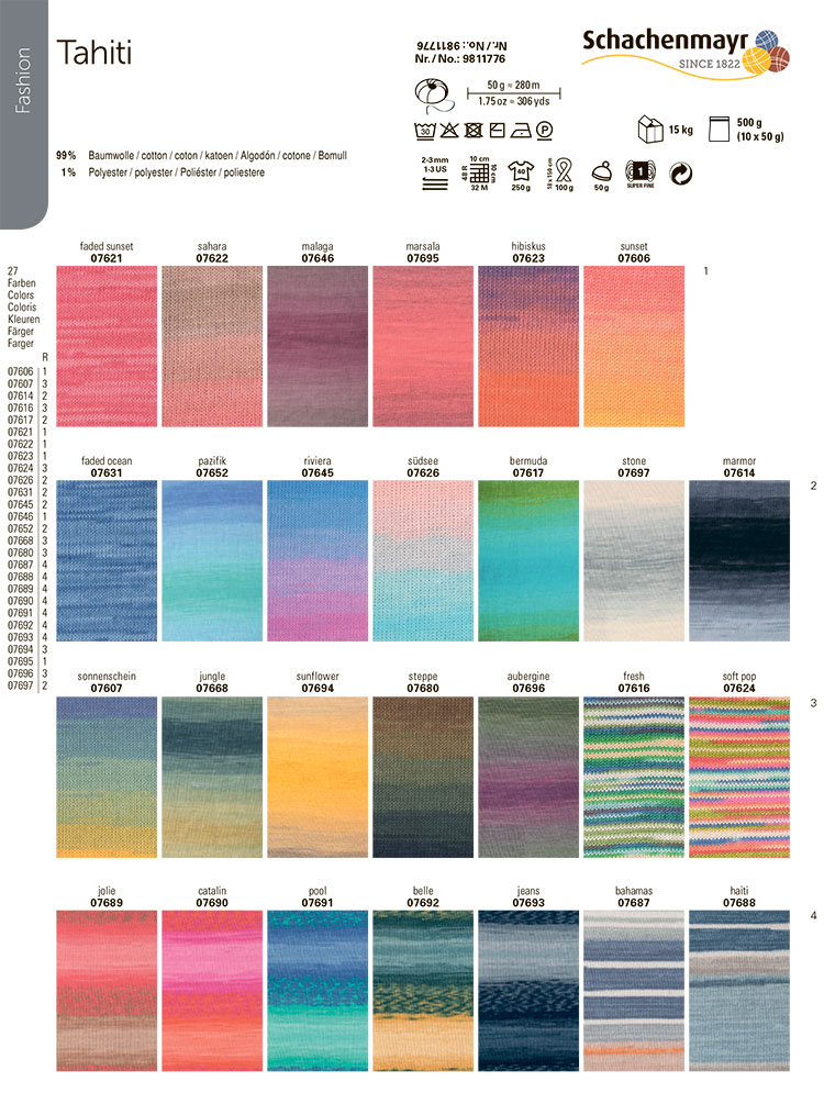 Schachenmayr регулярно меняет дизайн этикеток у своей пряжи, поэтому Tahiti может быть с этикетками разного дизайна в зависимости от года выпуска партии.
